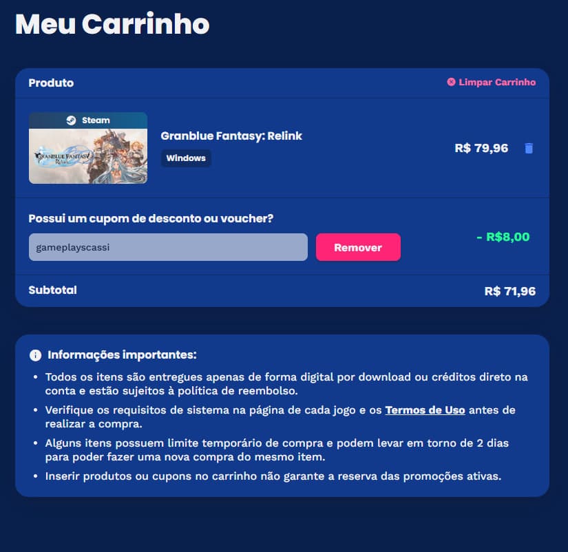 Granblue Fantasy: Relink recebeu um novo desconto e sai agora por R$ 71,96 na loja Nuuvem, com ativação no Steam. Para atingir este valor, é necessário aplicar o cupom de desconto GamePlaysCassi em seu carrinho.