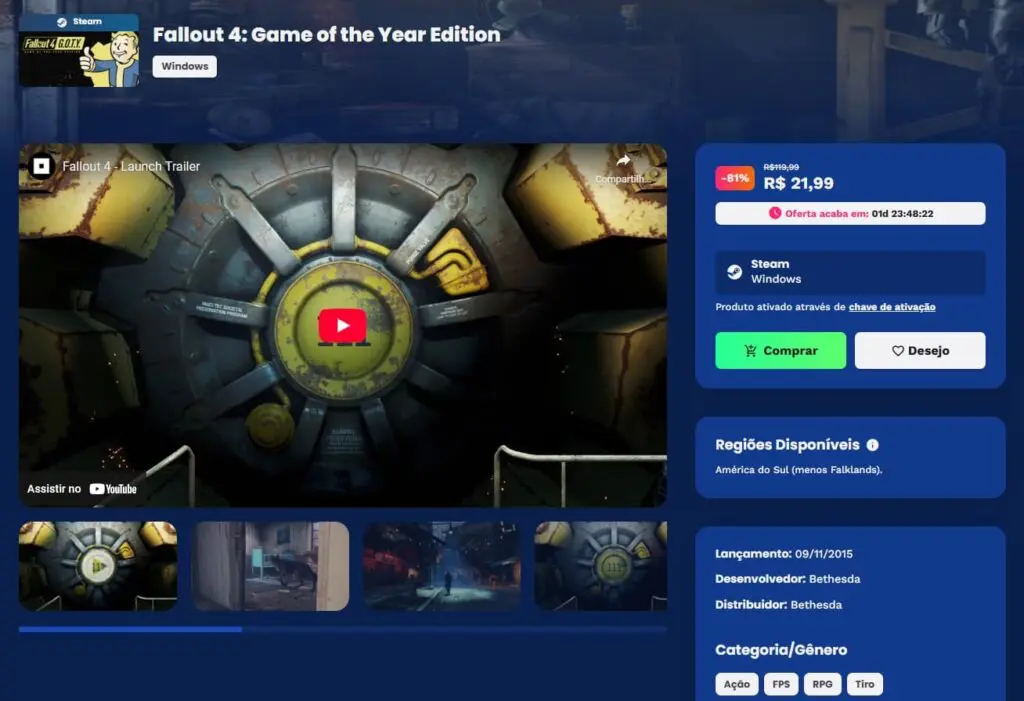Fallout 4: Game of the Year Edition está por R$ 21,99 na loja brasileira Nuuvem. Antes do super desconto, Fallout 4 custava R$ 119,99 e essa promoção já acaba na próxima segunda-feira, dia 6 de outubro.