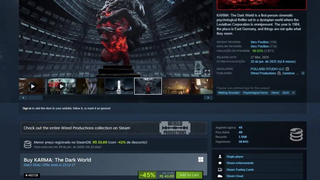 KARMA: The Dark World está por apenas R$ 67,82 no Steam, utilizando o cupom FAZOPIX. Antes do super desconto, KARMA: The Dark World custava R$ 249,50 no Steam. Porém, você precisa resgatar esses jogos até às 15h do dia 13 de fevereiro para ficar com ele.