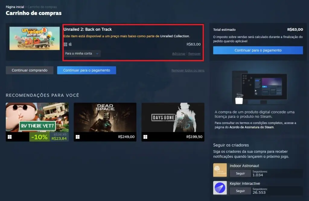 No exemplo da imagem acima, ao tentar comprar o game Unrailed 2: Back on Track por R$ 63, a loja do Steam vai notificar que o jogo está mais barato através do pacote Unrailed Collection, que custa R$ 57,59.