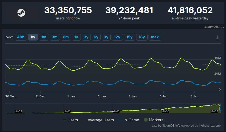 O início de janeiro marcou um novo recorde de jogadores online simultâneos no Steam: 41.816.052 jogadores. Esse recorde foi estabelecido no último domingo (04/01), por volta das 14h, pelo horário de Brasília.
