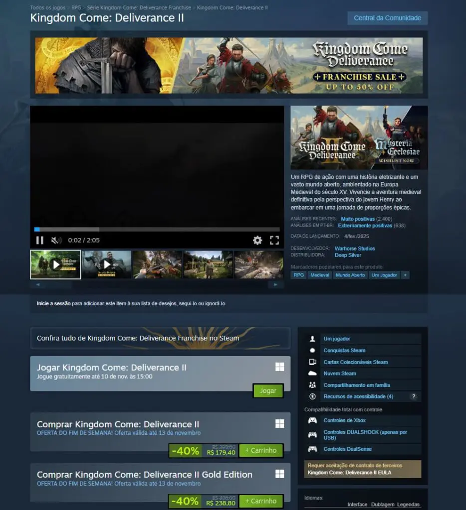 Note que a gratuidade de Kingdom Come: Deliverance II não é permanente, e após o dia 10 de novembro todos perdem o acesso ao jogo gratuito.