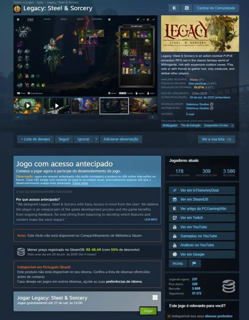 Note que a gratuidade de Legacy: Steel & Sorcery não é permanente, e após o dia 27 de outubro todos perdem o acesso ao jogo gratuito.