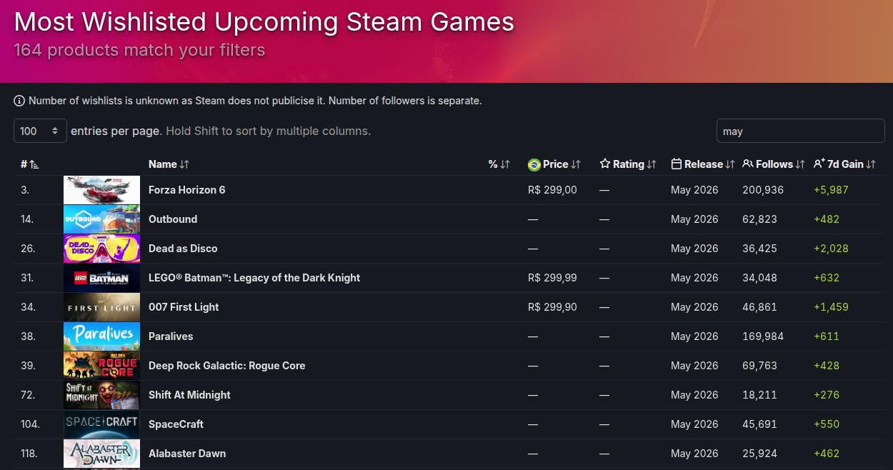 O mercado de games está fervendo com a chegada de Forza Horizon 6, que assumiu o topo da lista de desejos do Steam para maio. O novo título de corrida em mundo aberto superou grandes nomes e se tornou o favorito absoluto dos jogadores para o próximo mês.