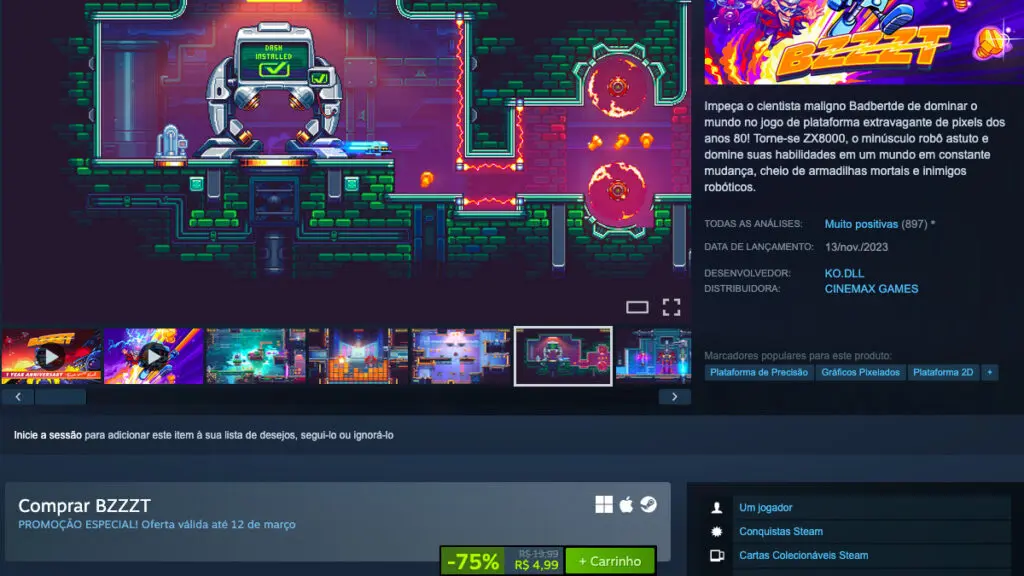 Quem sente falta de plataforma retrô desafiadora vai gostar dessa: BZZZT está em promoção no Steam e caiu de R$ 19,99 para apenas R$ 4,99. Um desconto enorme para um indie que mistura velocidade, precisão e muito carisma pixelado.