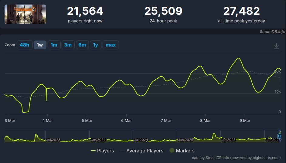 The Division 2 bateu mais uma vez seu recorde de jogadores online simultâneos no Steam, em meio à temporada de aniversário com recompensas exclusivas e o execelente desconto de 90% na loja da Valve. Enquanto o jogo de tiro contava com mais de 16.000 jogadores em 5 de março, esse número ultrapassou 27.000 no dia 8 de março. O recorde anterior datava de 2023, quando The Division 2 atraiu quase 15.000 jogadores durante seu fim de semana gratuito.