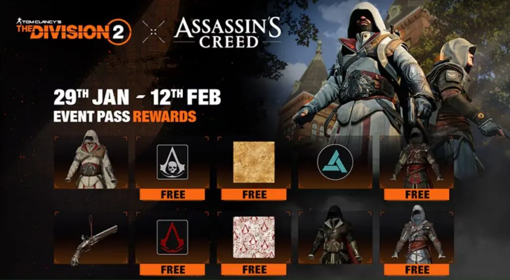 De 29 de janeiro a 12 de fevereiro, The Division 2 terá um crossover com a série Assassin’s Creed. Este evento por tempo limitado apresenta dois passes de progressão com uma variedade de itens inspirados na renomada franquia da Ubisoft. Alguns itens, incluindo skins de armas e patches, estão disponíveis gratuitamente.