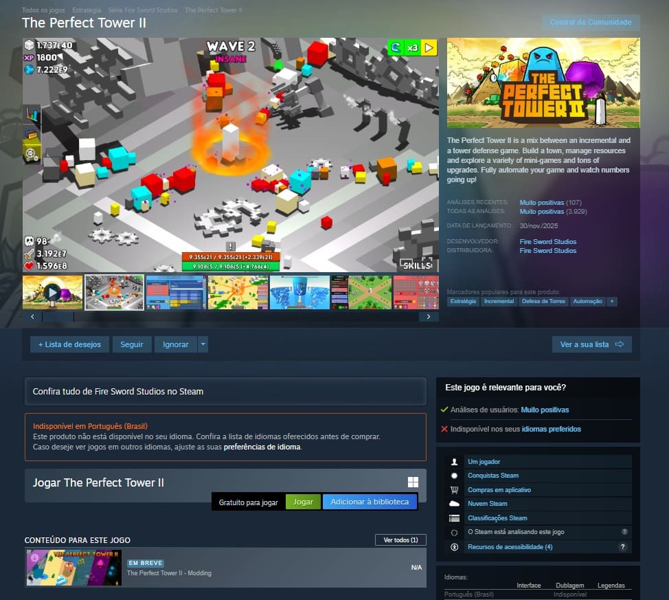A versão final do jogo gratuito The Perfect Tower II foi lançada hoje no Steam pela Fire Sword Studios, e todos já podem jogar o jogom de graça no PC.