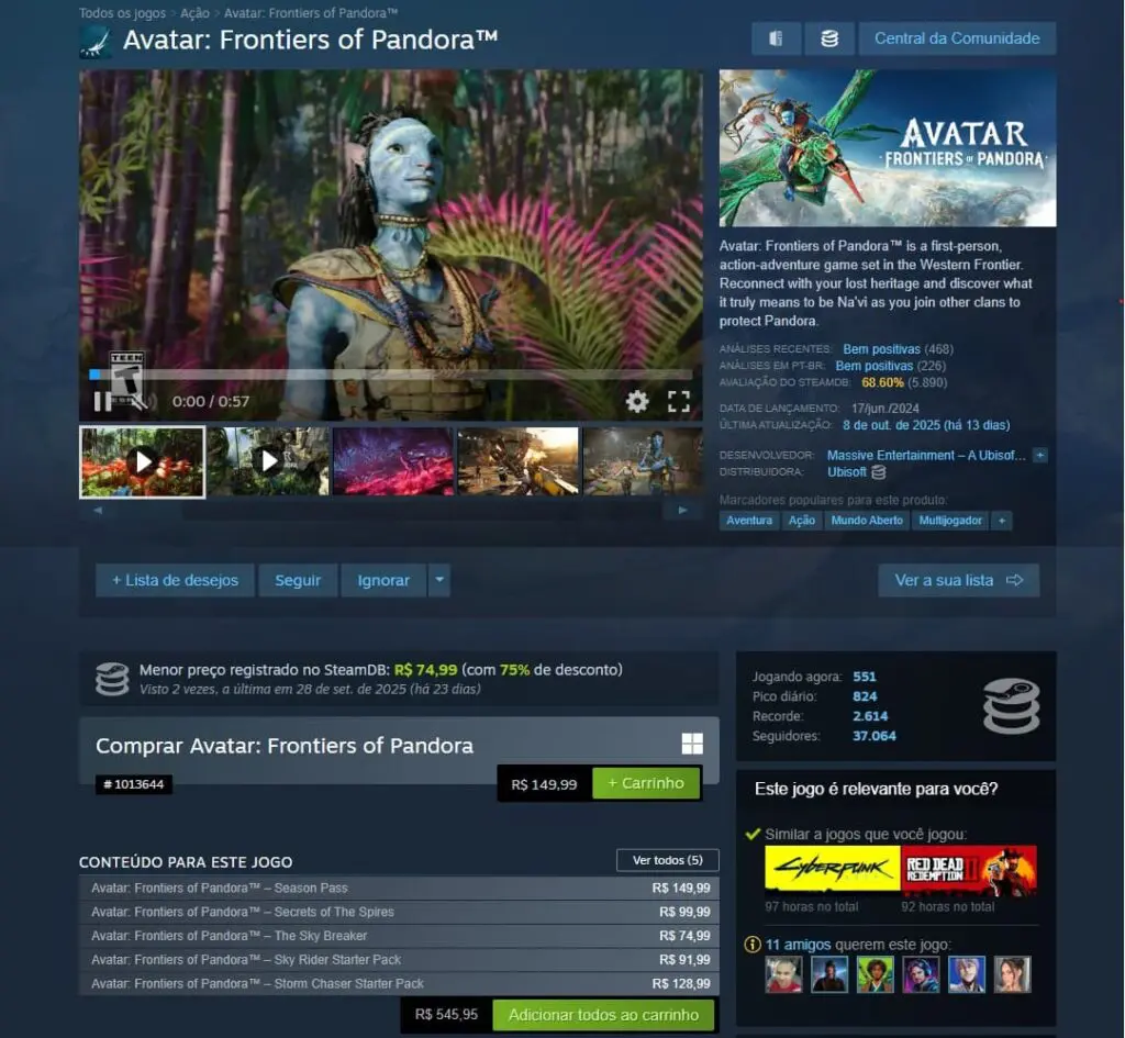 Completamente de surpresa, a Ubisoft derrubou o preço base de Avatar: Frontiers of Pandora em todas as plataformas, descendo de R$ 299 para R$ 149,99 no PC, PlayStation e para R$ 104,95 no Xbox.