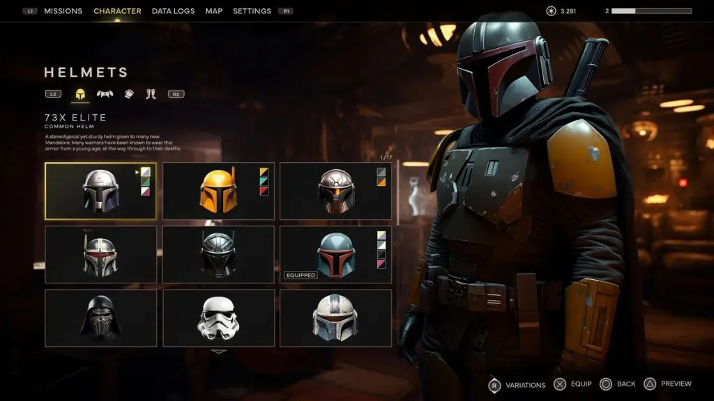 Outra imagem mostra as possíveis opções de personalização com diferentes cores e designs de capacete. Recursos semelhantes foram introduzidos em Star Wars Jedi: Survivor da Respawn Entertainment.