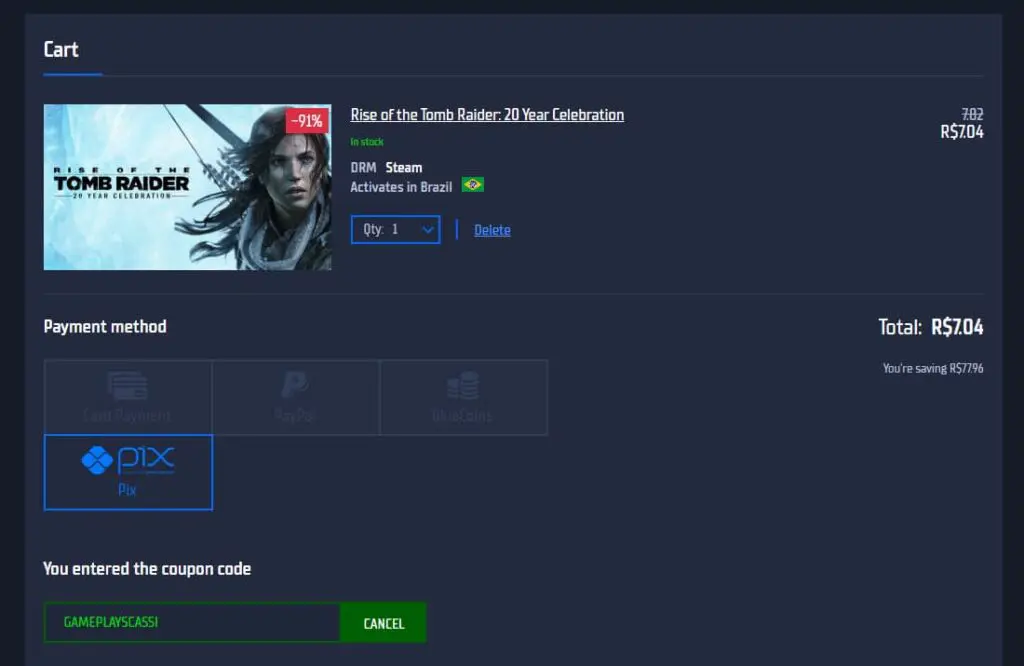 A loja GamersGate é como uma revendedora de jogos digitais, e ao realizar a compra de Rise of the Tomb Raider: 20 Year Celebration, você receberá um código e deverá ativar esse código em sua conta do Steam. A loja também aceita pagamento via PIX.