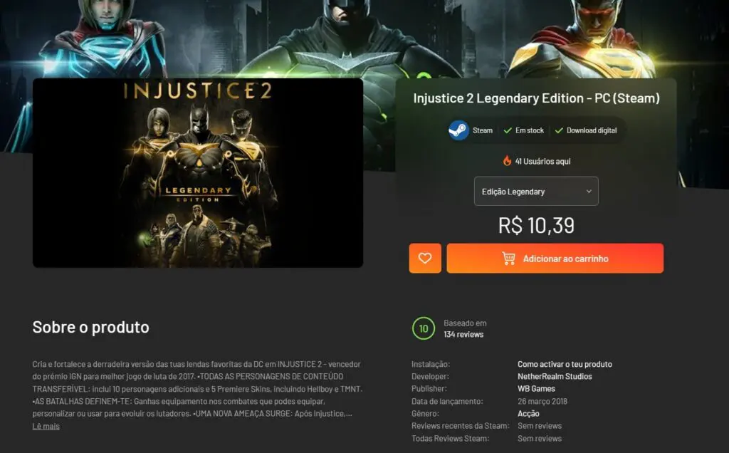 A loja Instant Gaming funciona como uma revendedora de jogos digitais, e ao realizar a compra de Injustice 2 Legendary Edition, você receberá um código e deverá ativar esse código em sua conta do Steam. A loja também aceita pagamento via PIX.