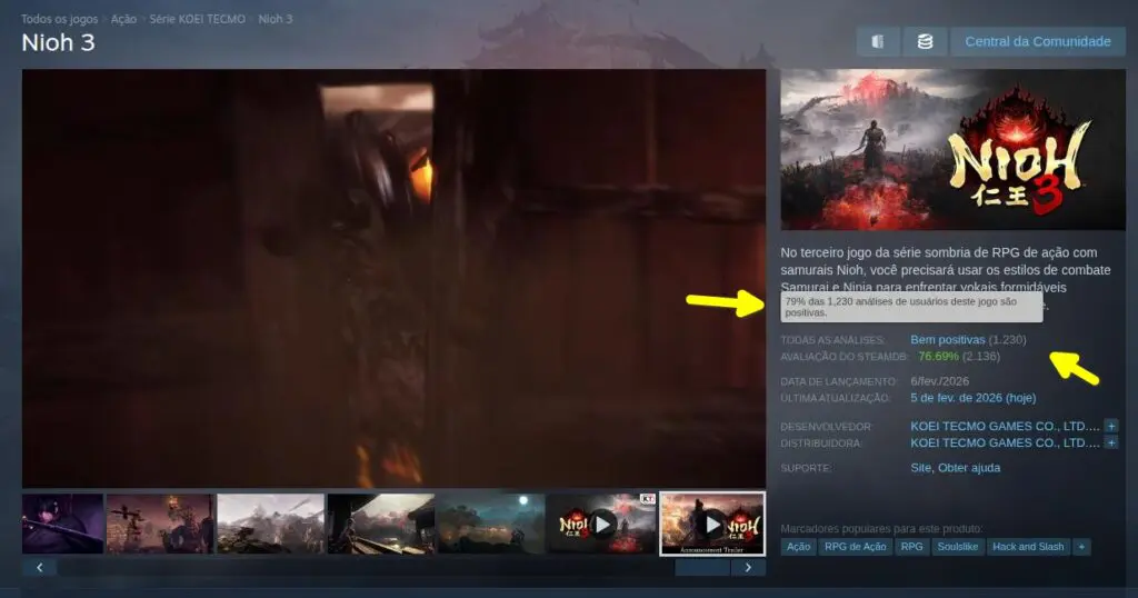 Hoje (6 de fevereiro), o jogo de ação Soulslike, Nioh 3, foi lançado no Steam, acumulando rapidamente centenas de avaliações de usuários. No momento da publicação deste texto, o jogo ostenta uma classificação positiva de 79%.