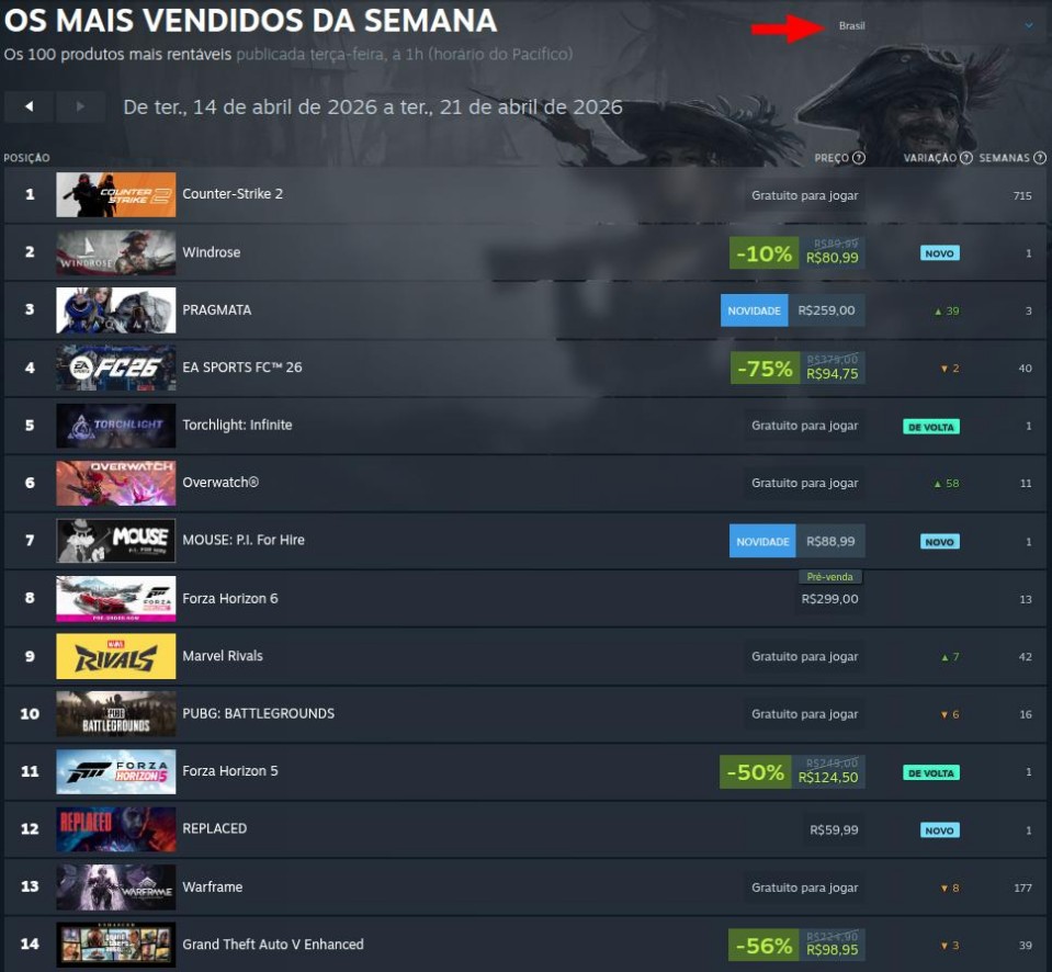 Porém, o terceiro lugar não está ocupado por MOUSE: PI For Hire, como no ranking global, e sim por EA Sports FC 26. MOUSE: PI For Hire aparece logo na sequência, ocupando o quarto lugar. No quinto lugar, vemos Forza Horizon 6.