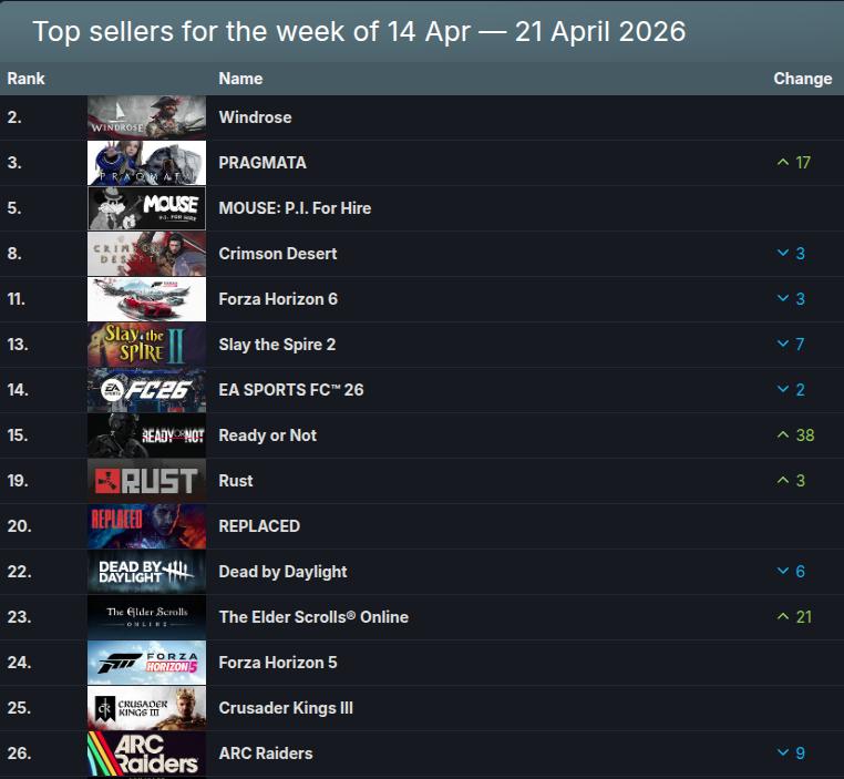 A maior surpresa foi a mudança no primeiro lugar: Crimson Desert, que ficou em primeiro lugar por 4 semanas consecutivas, perdeu a liderança para dois grandes lançamentos, Windrose e PRAGMATA. Ambos os jogos tiveram um início forte e rapidamente conquistaram os primeiros lugares entre os mais vendidos na loja da Valve.